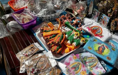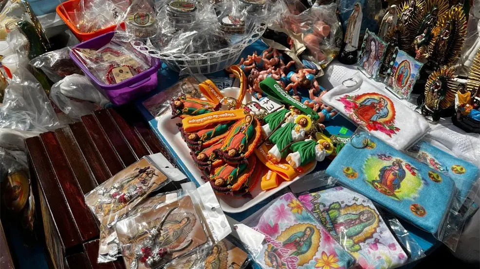Entre los artículos más populares destacan las figuras de la Virgen de Guadalupe en diferentes tamaños, que van desde pequeñas imágenes de bolsillo hasta representaciones que superan el metro de altura, explicó Roger Martínez, vendedor que se encuentra enfrente de la iglesia de San Cristóbal.