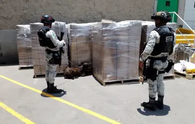 Elementos de la Guardia Nacional aseguraron 600 paquetes de posible marihuana y 39 kilogramos de una sustancia similar a la metanfetamina en una empresa de paquetería del Aeropuerto de Guadalajara.