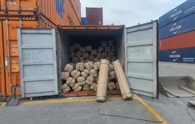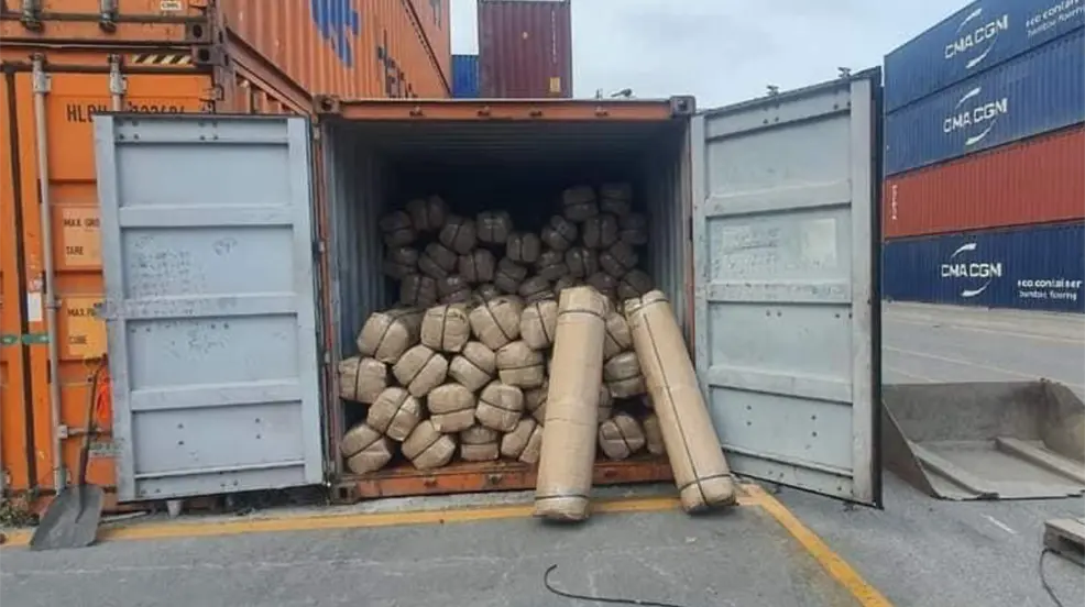 En un contenedor fueron encontrados 765 paquetes rectangulares y 582 paquetes cilíndricos envueltos en cinta canela y plástico transparente.