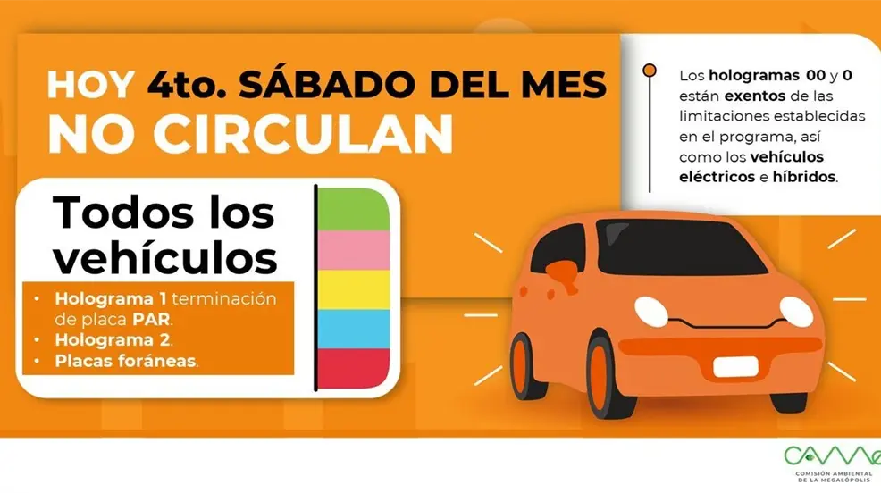 Para este cuarto sábado del mes de diciembre del 2023, los vehículos con holograma 1 y terminación de placas PAR (0, 2, 4, 6 y 8 ) no circulan, también aquellos conductores que cuenten con un carro con holograma 2 o placas foráneas, tampoco podrán andar por las calles del Valle de México.