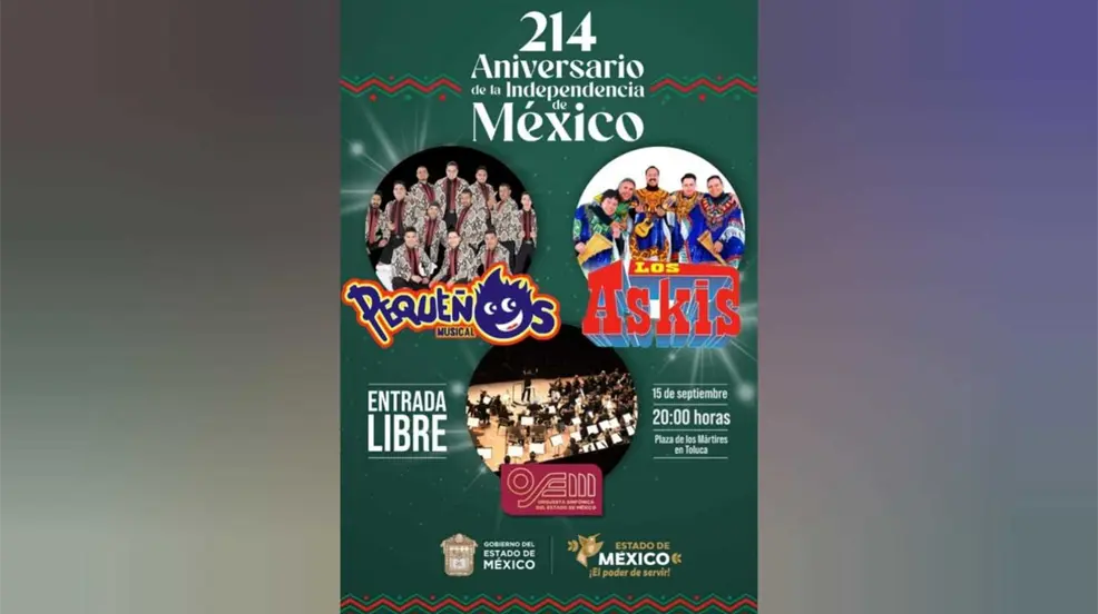 El acto cívico incluirá la tradicional ceremonia en la que la gobernadora Delfina Gómez Álvarez ondeará la bandera nacional desde el balcón principal de Palacio Nacional, y realizará arengas para conmemorar la Independencia de México. Posteriormente, los asistentes disfrutarán de un espectacular show de fuegos artificiales y una animada fiesta con la música de Los Askis, quienes ofrecerán un vibrante espectáculo de cumbia andina-mexicana.