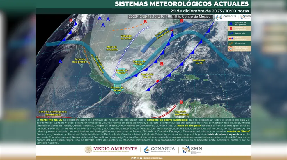 El frente frío en cuestión se extenderá hacia la Península de Yucatán, interactuando con diversos elementos atmosféricos, como una vaguada en niveles medios y altos de la atmósfera y la corriente en chorro subtropical. Esta interacción dará lugar a lluvias y chubascos en varias áreas de México, siendo las zonas más afectadas la península mencionada, así como el noreste, oriente y sureste del territorio nacional.