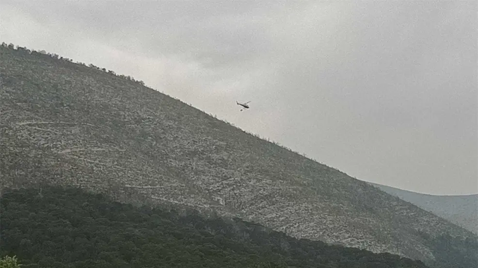 Se encuentra un helicóptero en la zona realizando descargas de retardante, con el objetivo de controlar el incendio lo antes posible y minimizar el daño ambiental.
