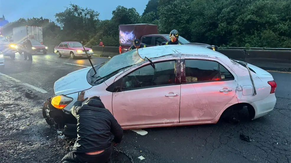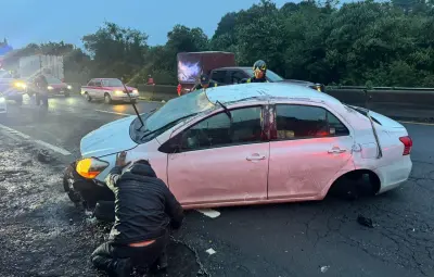 Auto compacto vuelca en la México- Toluca, conductor derrapó por piso mojado