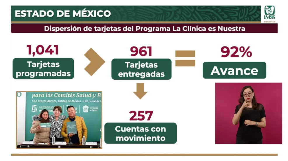 Durante la presentación de diapositivas, Zoe Robledo informó que de las mil 41 tarjetas programadas para entrega en el Estado de México, ya se han entregado 961, lo que representa un avance del 92 por ciento.