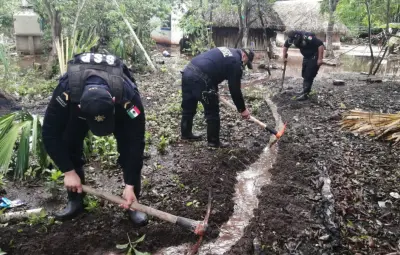 Elementos de la SSP Yucatán ayudaron a drenar el agua que afectaba a familias de Tiholop, en Yaxcabá, tras las intensas lluvias