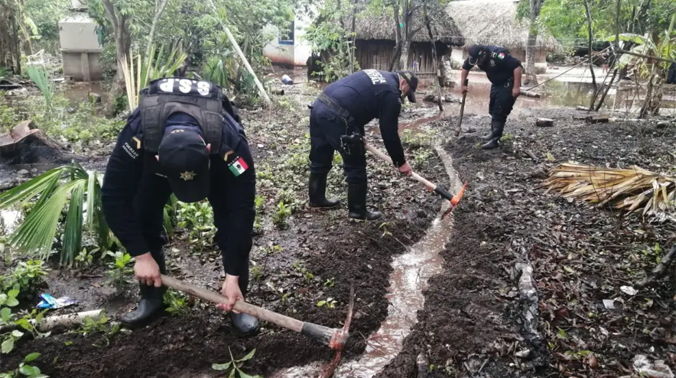 Con ayuda de picos, los uniformados hicieron zanjas en la tierra para que comenzara a drenar el agua hacia el monte y poco a poco comenzó a descender su nivel, así lo dio a conocer a través de sus redes sociales, la Secretaría de Seguridad Pública (SSP).