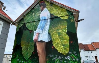 En su obra y ayudándose de una grúa, “Bache” plasmó sobre la pared lateral de un edificio la silueta de una mujer, quien esconde su rostro tras una hoja de un árbol, una pintura de gran escala que deja al descubierto el talento que detrás de las manos de Edgar se esconde.