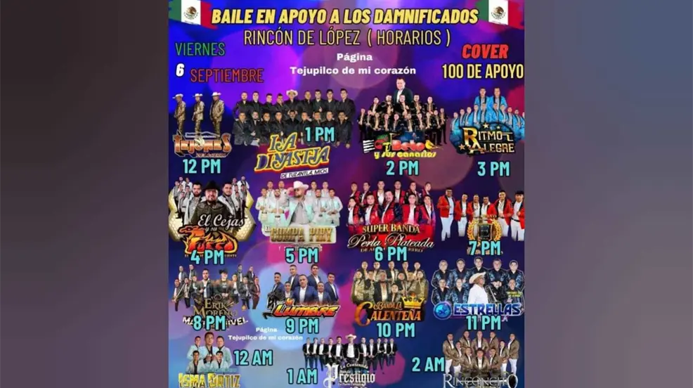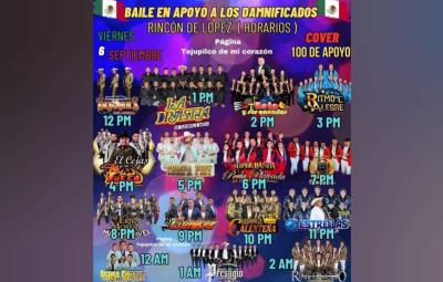 Para ayudar a los afectados, diversos grupos musicales han organizado un baile benéfico que se llevará a cabo el viernes 6 de septiembre en Tejupilco. El evento contará con la participación de La Dinastía de Tuzantla, Beto y sus Canarios, El Cejas y su Fuego, entre otros 13 grupos de música sureña. La entrada tendrá un costo de $100, y todo lo recaudado será destinado a los damnificados.