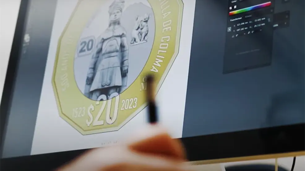 La nueva moneda de 20 pesos tiene en su anverso el característico escudo nacional de México. En el reverso, en el centro, se encuentra la imagen del Rey Colimán, un personaje histórico significativo. A la derecha, aparecen los perritos colimotes, también conocidos como perritos bailarines, y al fondo, la silueta del volcán de Colima.