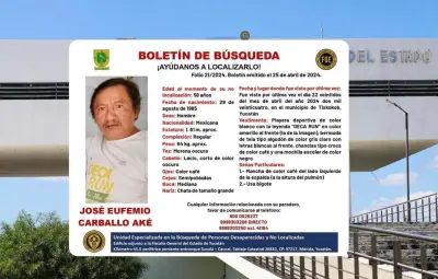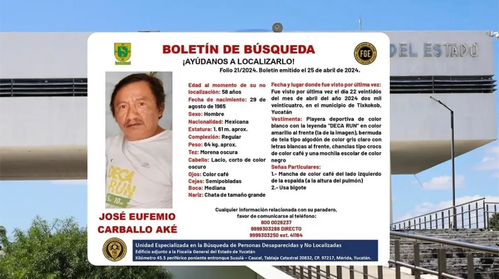 MÉRIDA, Yucatán.- La Comisión de Búsqueda de Personas del Estado de Yucatán, en conjunto con la Fiscalía General del Estado (FGE), ha emitido una alerta urgente para solicitar la colaboración ciudadana en la localización del ciudadano JOSÉ EUFEMIO CARBALLO AKÉ de 58 años de edad, visto por última vez en Tixkokob, Yucatán.