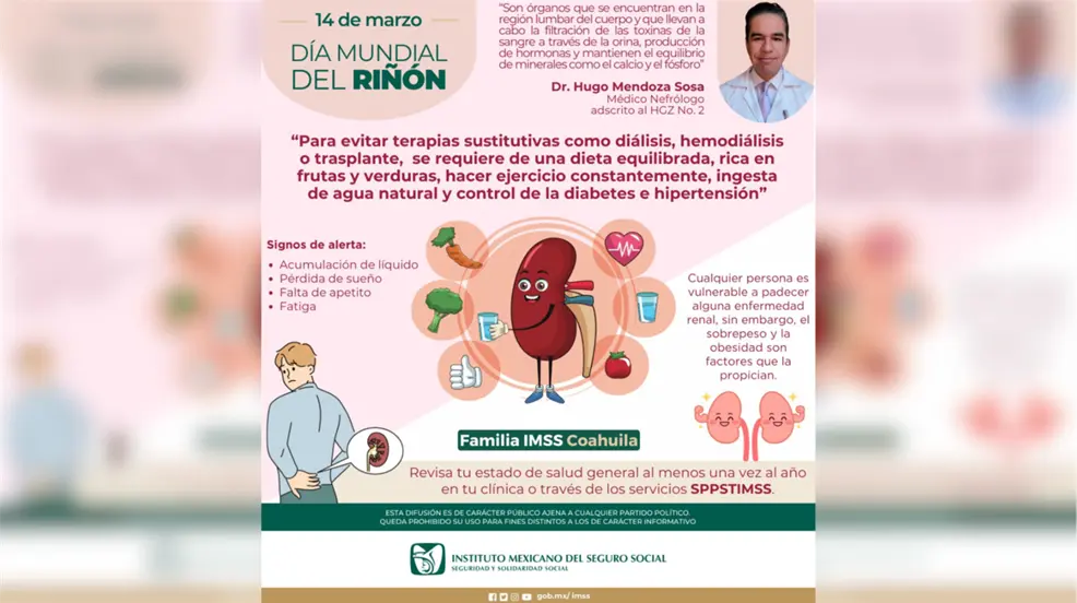 SALTILLO, Coahuila. - El Instituto Mexicano del Seguro Social (IMSS) brinda atención a cerca de 80 mil personas con terapia de reemplazo renal a nivel nacional, según informó el coordinador de Programas Médicos, doctor Roberto Teva Luna. Esta cifra resalta la importancia de la detección temprana de la Enfermedad Renal Crónica (ERC) y la necesidad de acudir a las Unidades de Medicina Familiar para ello.
