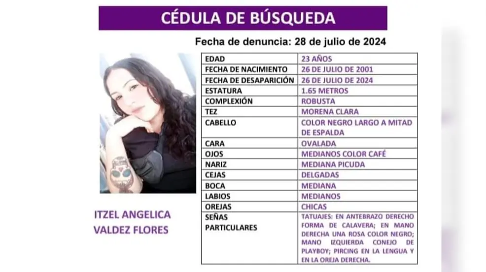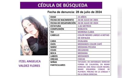 Se emitió una ficha de búsqueda para Itzel Angélica Valdez Flores, una mujer de 23 años que desapareció en un fraccionamiento de Durango el pasado 26 de julio.