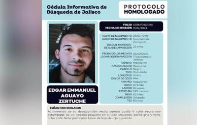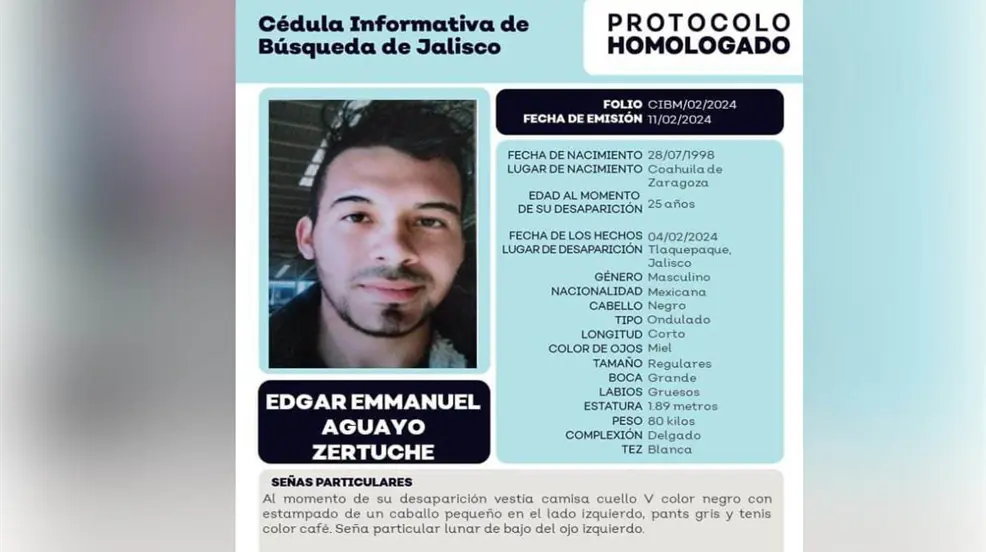 TORREÓN, Coahuila.- Edgar Emmanuel Aguayo Zertuche, un joven originario de Coahuila, fue reportado como desaparecido desde el pasado 4 de febrero de 2024 en el municipio de Tlaquepaque, Jalisco. Según la cédula informativa emitida por las autoridades locales, Edgar, de 25 años, fue visto por última vez en la colonia San Pedrito alrededor de las 15:00 horas.