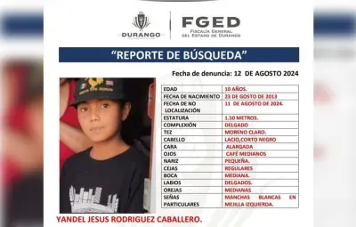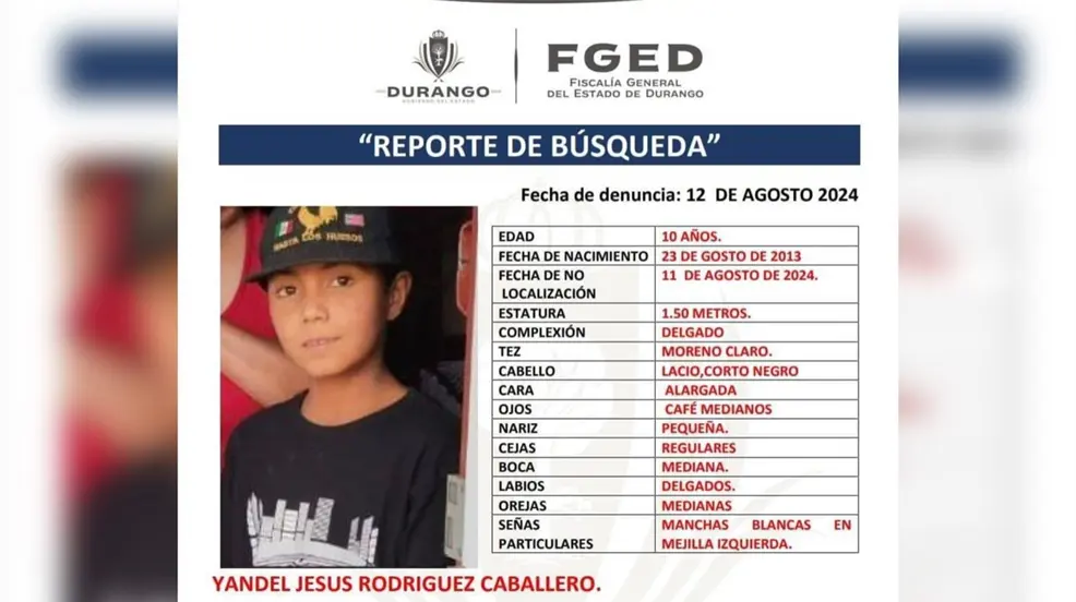 La Fiscalía General del Estado emitió una ficha de búsqueda para encontrar a Yandel Jesús Rodríguez Caballero, un niño de 10 años que está desaparecido en Durango.