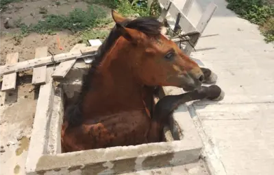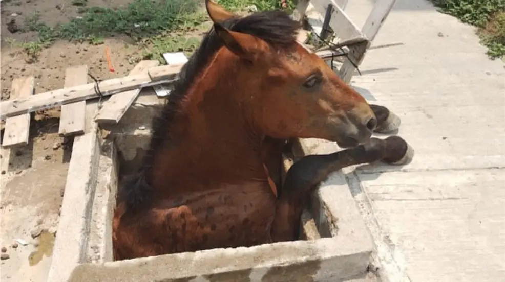 El equino paseaba y en un mal paso sus patas traseras cayeron en el hoyo, quedando por fortuna su cabeza de fuera.