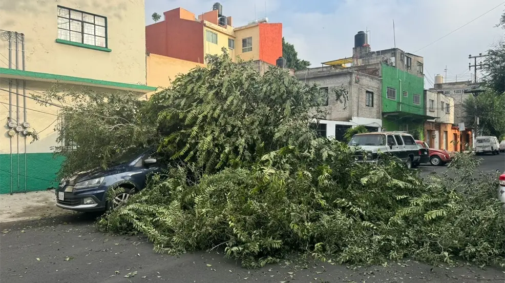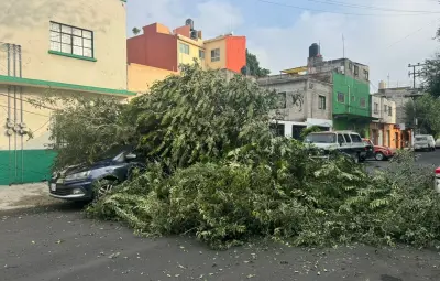 Ocurrió sobre la calle Imuris esquina con Agiabampo en la colonia Obregón de la alcaldía Venustiano Carranza, donde el árbol cedió y cayó sobre dos vehículos y a su paso, derribó cableado de luz y de fibra óptica.