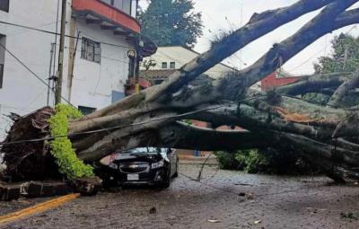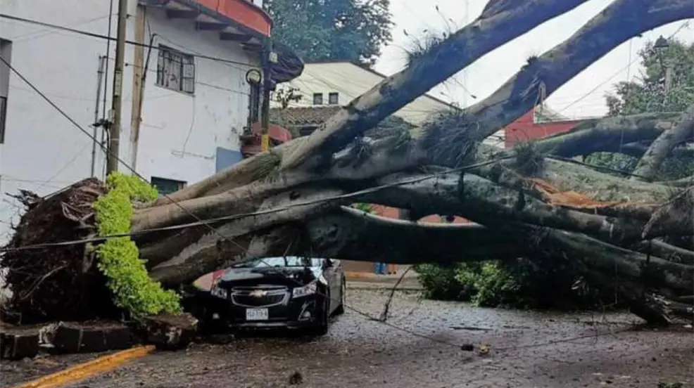 Este sábado en Xalapa, un árbol de unos 15 metros y más de 70 años de antigüedad cayó sobre la calle Diego Leño, esquina con Bremont, a una cuadra de los Berros.