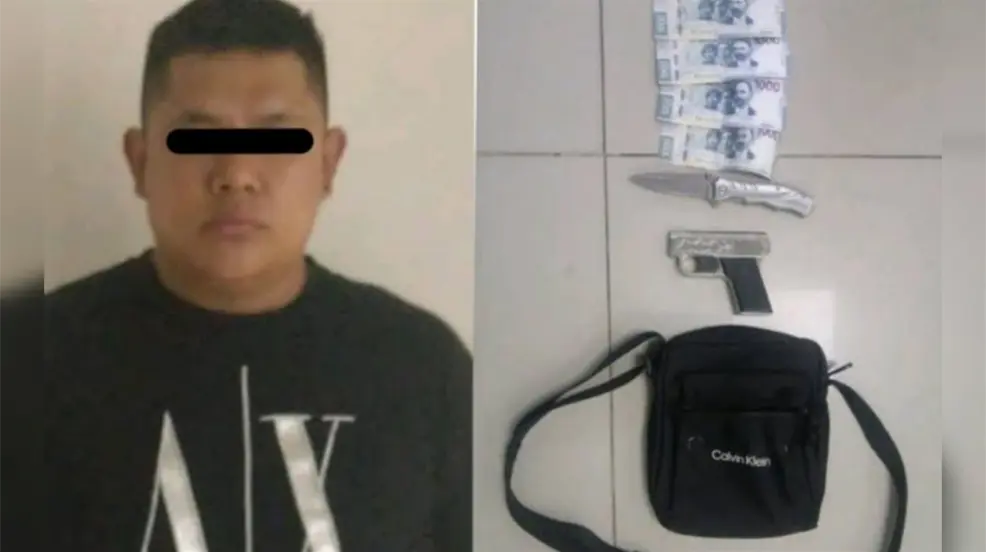 En la colonia Valle de Aragón, policía de Ecatepec detuvo a Jorge Luis, acusado de extorsionar con 100 mil pesos al dueño de un taller para no dañar a su familia.