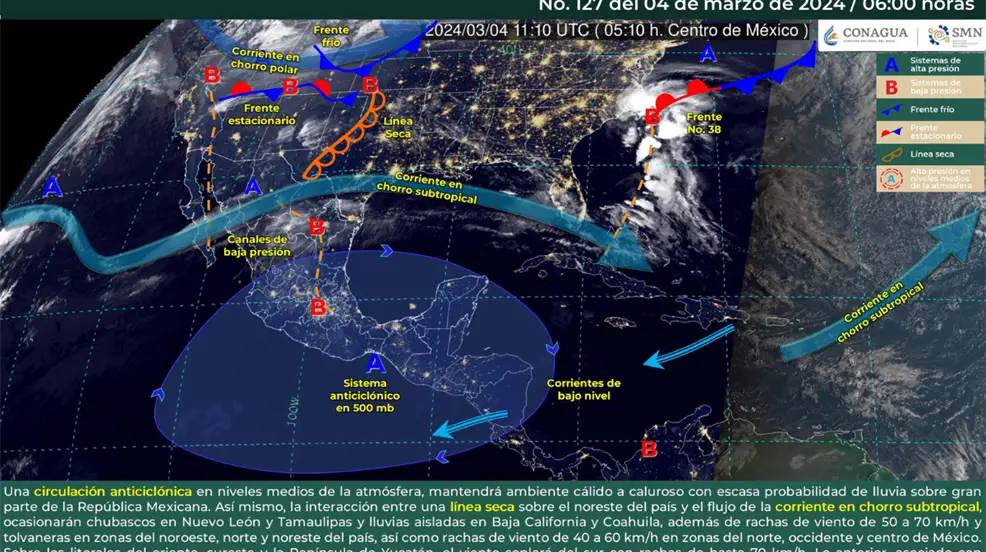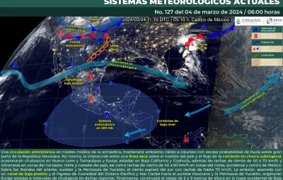 A pesar de ello, una línea seca sobre el noreste del país y el flujo de la corriente en chorro subtropical harán interacción, cuestión que ocasionará chubascos y lluvias aisladas en el noroeste y noreste del país. A lo anterior, se sumarán rachas de viento de 50 a 70 km/h y tolvaneras en el noroeste, norte y noreste del territorio nacional, así como rachas de viento de 40 a 60 km/h en el norte, occidente y centro de la República Mexicana.
