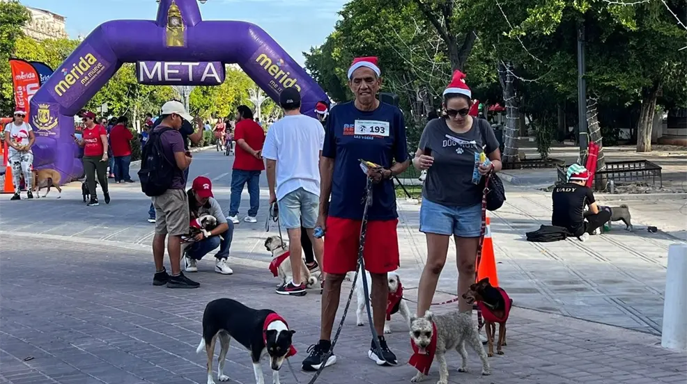 MÉRIDA, Yucatán.- Con disfraces de Santa Claus, perros pugs, pomeranias, chihuahuas, hoskys, salchichas, entre otros, participaron en la caminata de 1 y 3 km en favor de las asociaciones Cinco Patas A.C. y Perpópolis A.C. que requieren saldar un adeudo de 85 mil pesos en servicios veterinarios por rescatar perritos y gatos de la calle, informó Lourdes Durán, organizadora del evento.