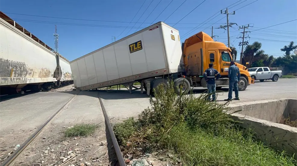RAMOS ARIZPE, Coahuila - Este jueves 19 de septiembre, un camión de carga intentó ganarle el paso al tren en las vías ferroviarias de la carretera Los Pinos, en Ramos Arizpe. Como suele ocurrir en estos casos, el intento fue infructuoso, y el transporte de carga terminó siendo impactado por el tren.