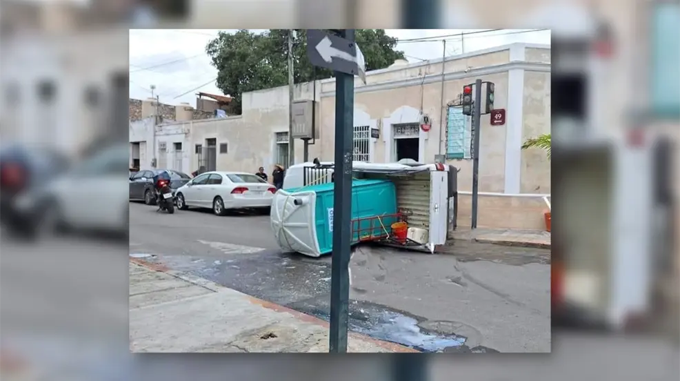 MÉRIDA, Yucatán.- Un aparatoso accidente ocurrió en Mérida, dejando cuantiosos daños materiales. El incidente tuvo lugar en la esquina de la calle 49 con 62, justo en la entrada del popular bar La Negrita, cuando un camión distribuidor de la empresa Propulsa colisionó con una camioneta tipo estaquitas que transportaba un baño portátil.