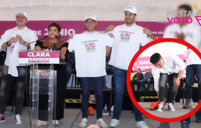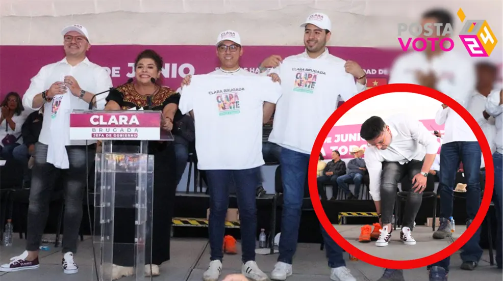 CIUDAD DE MÉXICO.- Durante un mitin de la candidata a la Jefatura de Gobierno Clara Brugada, por la coalición 'Sigamos Haciendo Historia', el Candidato a Diputado Local por el distrito 16, Martín García, declinó a favor del proyecto de la morenista, quitándose sus tenis 'Fosfo Fosfo' por unos guinda en pleno evento en el pueblo de San Miguel Topilejo, Tlalpan.