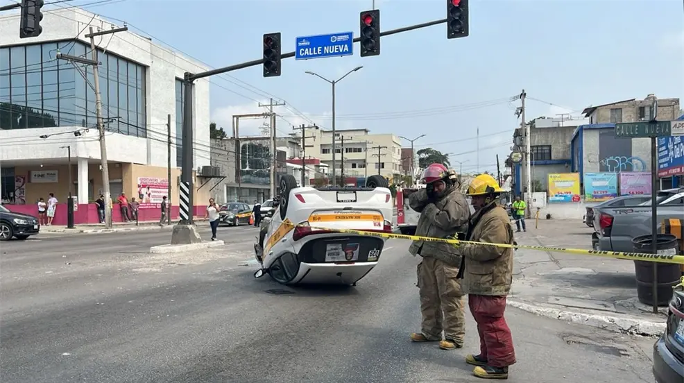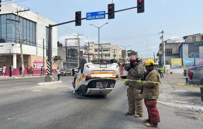 A los pocos minutos, se registró un aparatoso choque volcadura entre un taxista que transitaba sobre Avenida Hidalgo en los carriles de norte a sur, y una camioneta que salía sin precaución de un estacionamiento a la altura de la calle Nueve.