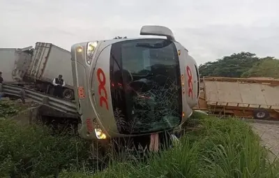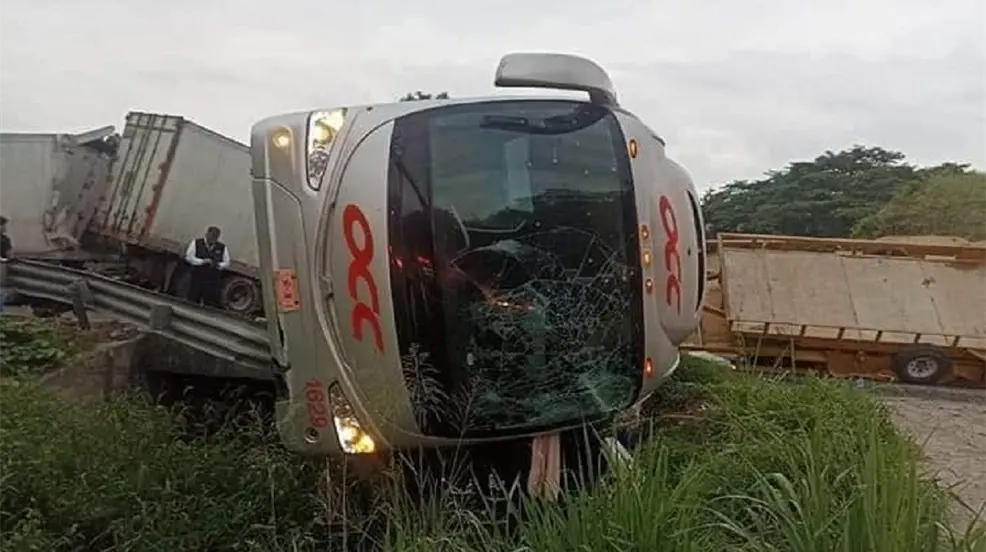 El autobús de pasajeros de la línea OCC quedó volcado a un costado de la vialidad y uno de los tráileres quedó sobre una cuneta que divide los carriles.