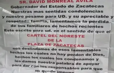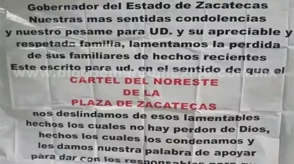 ¿Cartel del Noreste manda condolencias al gobernador de Zacatecas?