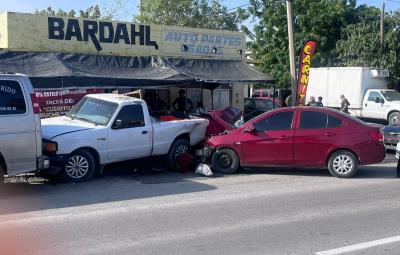 Por esquivar a la mujer, el conductor del automóvil Chevrolet desvió su trayectoria hacia su lado derecho y se impactó contra la caja de una camioneta marca Ford Ranger propiedad de un negocio de venta de carnitas.