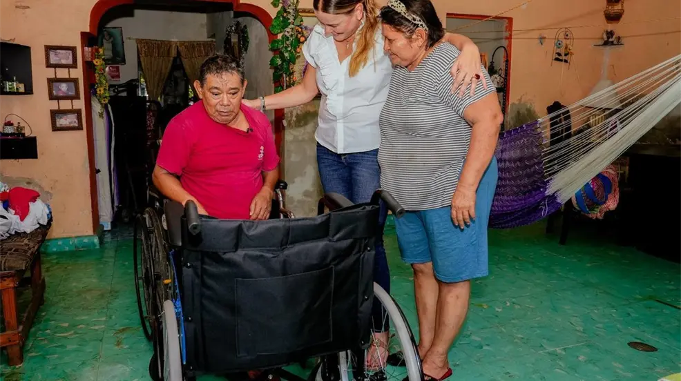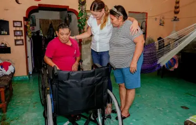 Posteriormente, en la colonia Melitón Salazar, Cecilia acudió al domicilio de José Felipe Chan, para entregarle una silla de ruedas que facilitará la atención que requiere debido a una embolia que afectó su motricidad.