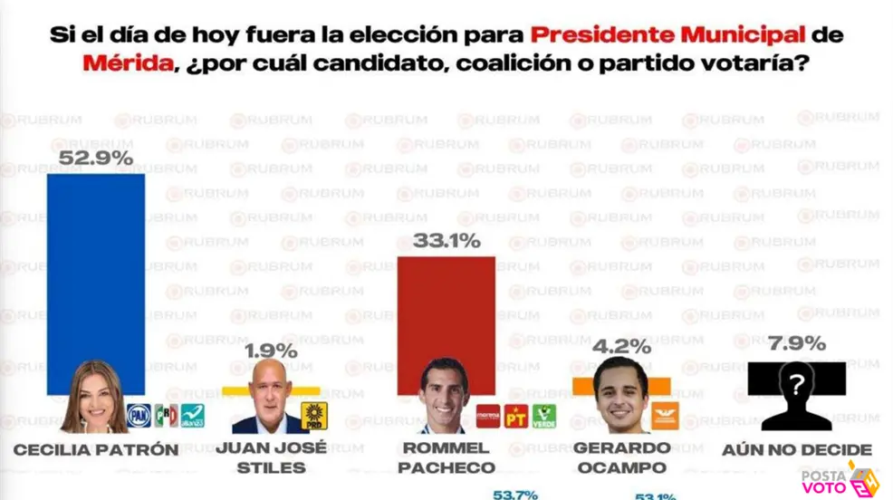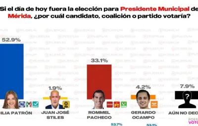 Las cifras exactas de estas encuestas son reveladoras: Rubrum muestra un 52.9% de preferencias del voto para Patrón Laviada contra un 33.1% para Pacheco Marrufo. La Encuesta.mx indica un 49.8% frente a un 31.2%, Áltica marca un 52% contra 34%, y Massive Caller registra un 54% contra 35.7%. Estas diferencias de entre 18 y 20 puntos consolidan una ventaja de dos dígitos, considerada inalcanzable especialmente con tan poco tiempo antes de la votación.