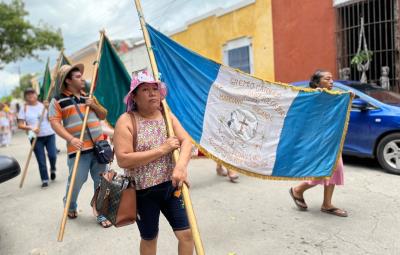 El contraste entre la solemnidad de la procesión y el estruendo de los tambores y cornetas de la banda de guerra, que marcaban el paso de los devotos, creó un ambiente único que refleja la rica fusión de lo sagrado y lo popular que caracteriza a las celebraciones religiosas en Yucatán.