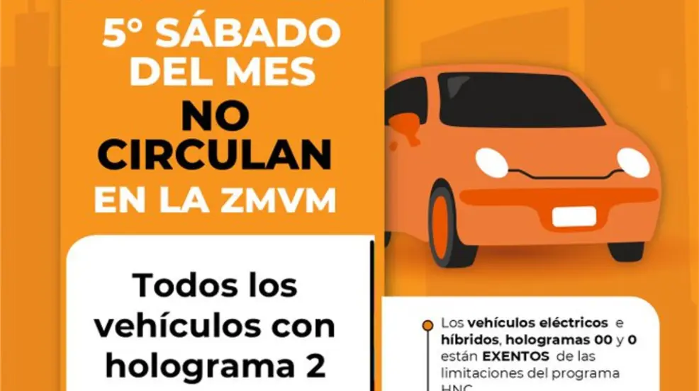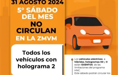 Este sábado 31 de agosto, se establece la restricción para la circulación de vehículos con holograma 2 y placas foráneas. Estas medidas forman parte del programa 'Hoy No Circula', cuyo objetivo es reducir la emisión de gases contaminantes en la Zona Metropolitana del Valle de México.