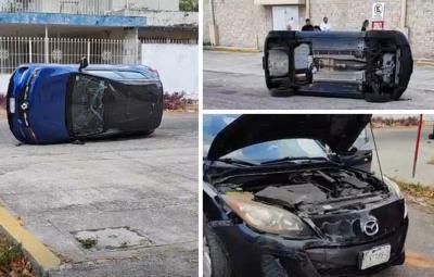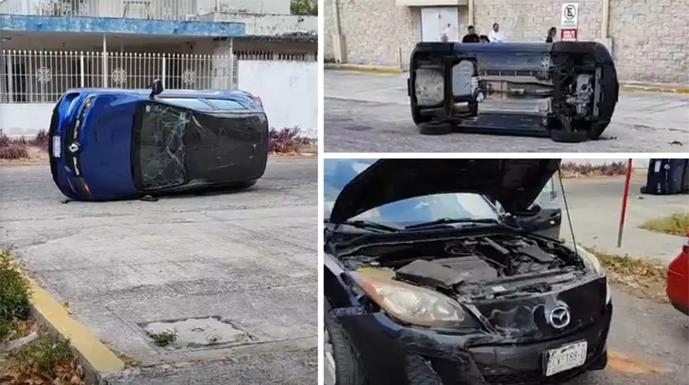 El Renault se desplazaba hacia el sur por la calle 15, cerca de la Prolongación Montejo, cuando fue golpeado en su costado izquierdo por el Mazda 3 que circulaba hacia el poniente. El impacto provocó que el Renault girara 180 grados y terminara volcando sobre su costado izquierdo, mientras que el Mazda sufrió daños en la parte delantera.
