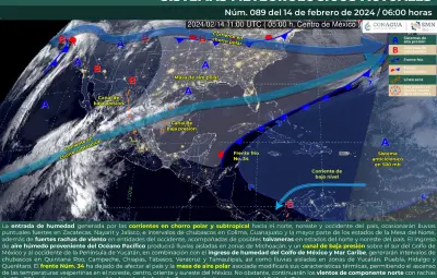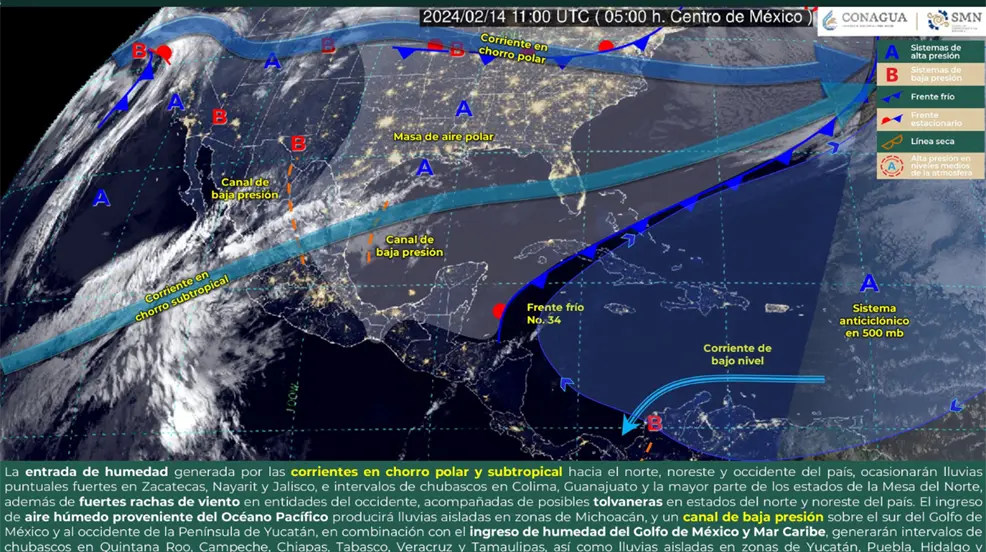 CIUDAD DE MÉXICO.- Para este miércoles 14 de febrero, se ha reportado que entrará humedad debido a corrientes en chorro polar y subtropical en el norte, noreste y occidente de México, lo cual ocasionará lluvias fuertes en el noroeste, norte, centro y parte del Pacífico mexicano.