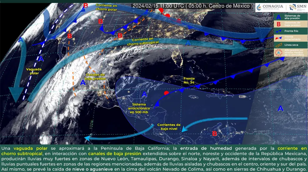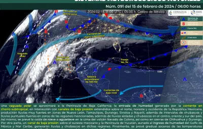 CIUDAD DE MÉXICO.- Para este jueves 15 de febrero, una vaguada polar se aproximará a la Península de Baja California. A la vez, debido a la entrada de humedad ocasionada por la corriente en chorro subtropical, que, en interacción con canales de baja presión sobre el norte, noreste y occidente de México, producirá lluvias, intervalos de chubascos y lluvias puntuales fuertes en entidades de dichas regiones.