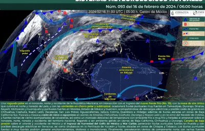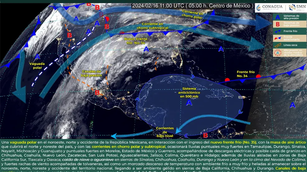 CIUDAD DE MÉXICO.- Para este viernes 16 de febrero, una vaguada polar se desplazará sobre el noroeste, norte y occidente de México, la cual hará interacción con el nuevo frente frío no.35, el cual ingresa este día al país.