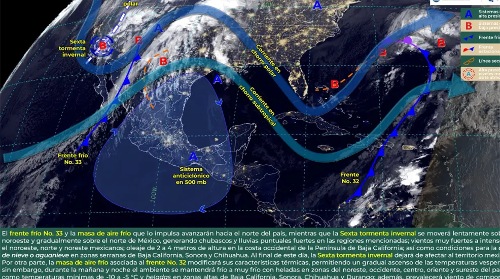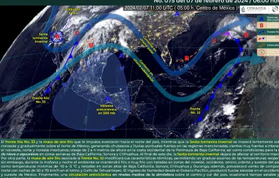 El Servicio Meteorológico Nacional ha emitido su pronóstico para este 7 de febrero, que continuará la presencia del frente frío no. 33 y la sexta tormenta invernal sobre el país