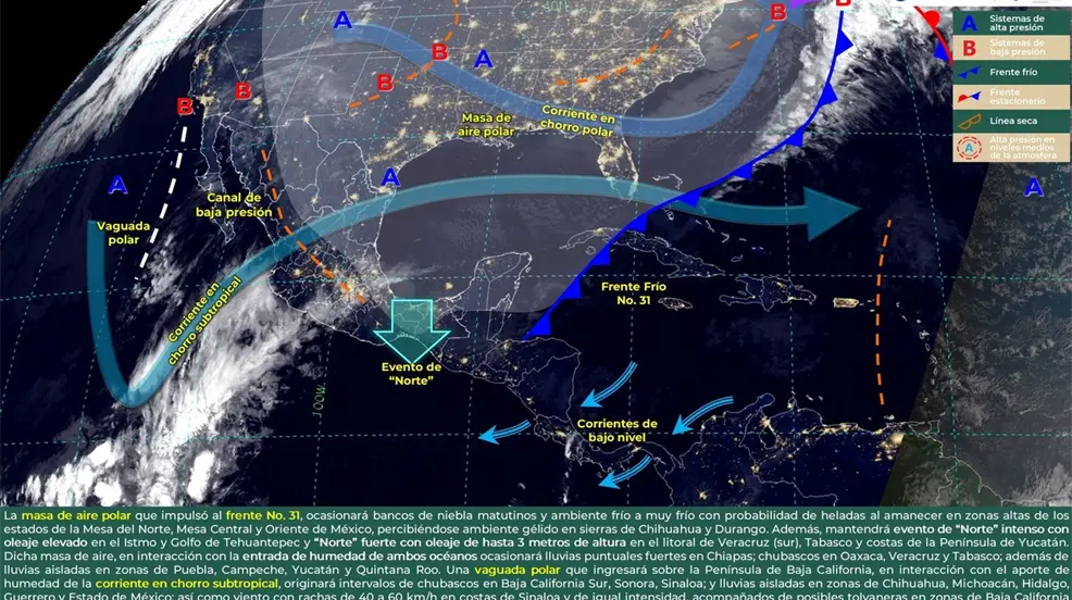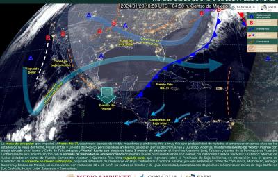 Además, debido al evento de “Norte”, más su interacción con la entrada de humedad desde los océanos Pacífico y Atlántico, ocasionará lluvias fuertes en Chiapas, más lluvias en estados del suroeste, sureste y Golfo de México. Asimismo, debido al ingreso de una vaguada polar desde la Península de Baja California, que se encontrará con una corriente de chorro subtropical, originará chubascos en dicha península, más estados del norte, noroeste y centro del país.