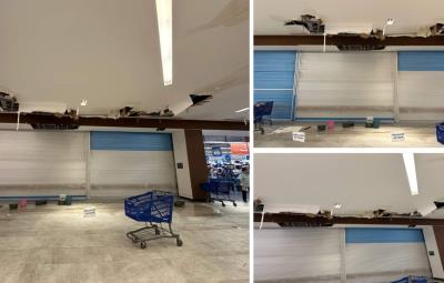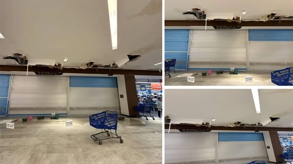 Un parte de las duelas del techo de una plaza comercial al norte de Mérida colapsó debido a la humedad generada por las intensas lluvias