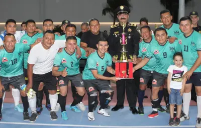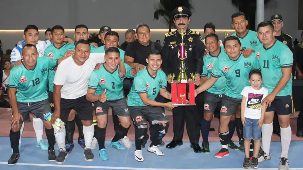 MÉRIDA, Yucatán.- El Comisario General Luis Felipe Saidén Ojeda, titular de la corporación, encabezó la entrega de trofeos y clausura del evento en la cancha del edificio central de la SSP. Participaron 22 equipos varoniles y 4 femeniles integrados por personal operativo y administrativo.