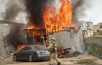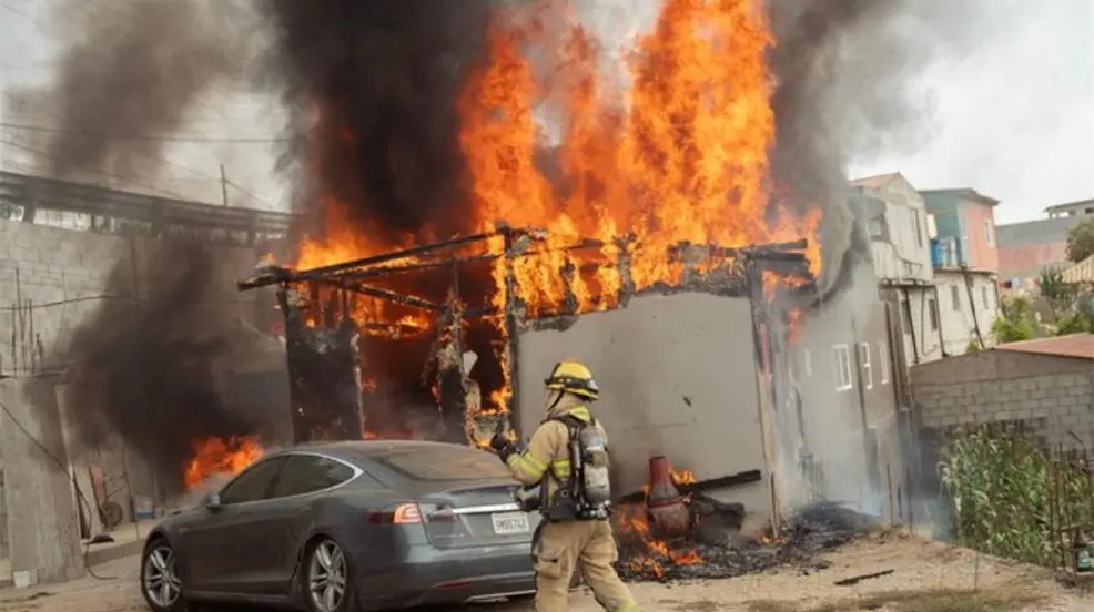 Un vehículo de la marca Tesla fue conectado a un poste de luz en en la colonia Lázaro Cárdenas, en el municipio de Tijuana, el cual terminó provocando una fuerte explosión que calcinó una vivienda.