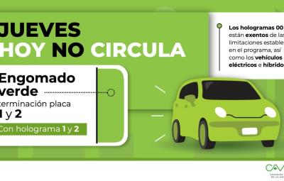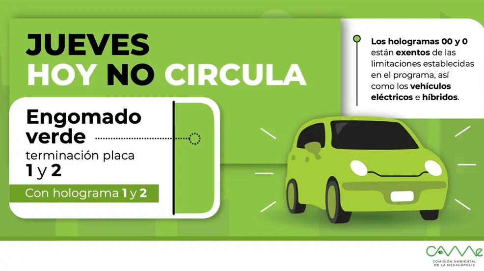 CIUDAD DE MÉXICO.- Este jueves 13 de julio de 2023, el programa vehicular 'Hoy No Circula' funciona de la siguiente manera: todos los autos con engomado color verde, terminación de placas 1 y 2, y que porten el holograma 1 o 2 no podrán circular por las calles de las 16 alcaldías que componen a la Ciudad de México y a 18 municipios del Estado de México.