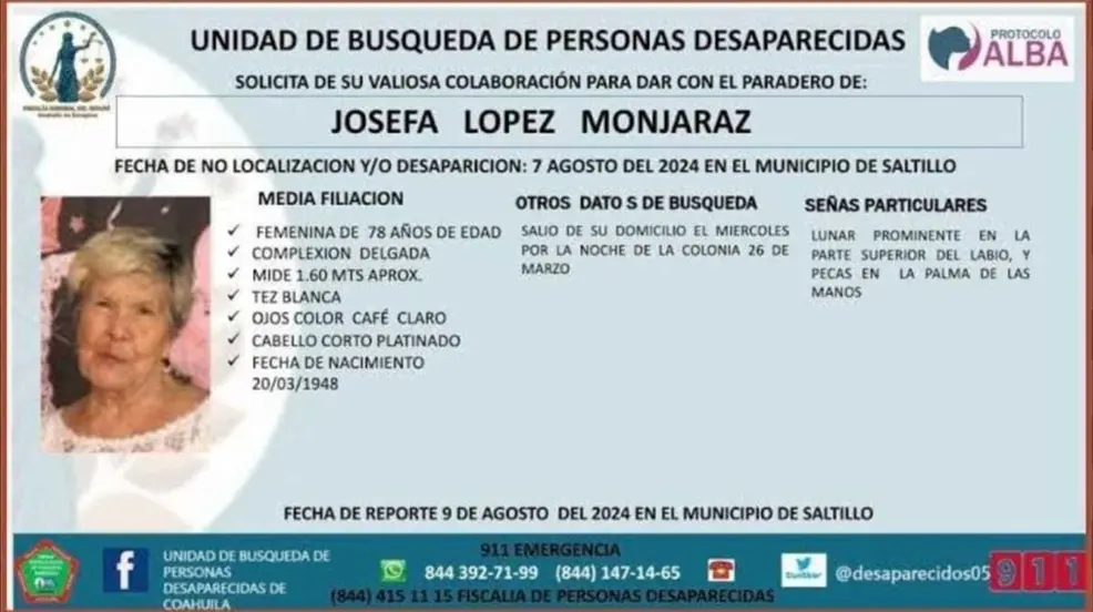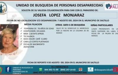 La familia de la señora Josefa López, desaparecida desde el miércoles por la noche en Saltillo, hace un llamado urgente a las autoridades y a la comunidad para obtener información sobre su paradero.