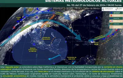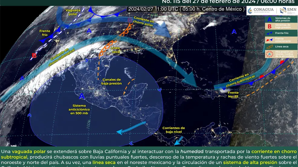 CIUDAD DE MÉXICO.- Este martes 27 de febrero, una vaguada polar se extenderá sobre Baja California, por lo que, debido a su interacción con humedad transportada por la corriente en chorro subtropical, sucederán chubascos con lluvias puntuales fuertes, descenso de temperaturas y rachas de vientos fuertes sobre el noroeste y norte de México.