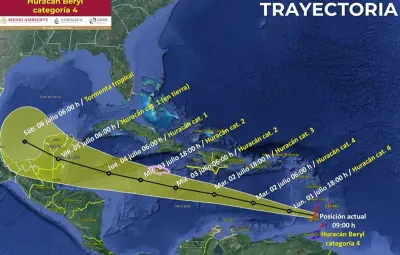 Méndez Girón también destacó que, para el jueves, 'Beryl' podría ser un huracán de categoría 1 o 2. Si mantiene su trayectoria, podría tocar tierra durante la noche del jueves o en la madrugada del viernes en la región centro-sur de Quintana Roo, con vientos superiores a 120 km/h.
