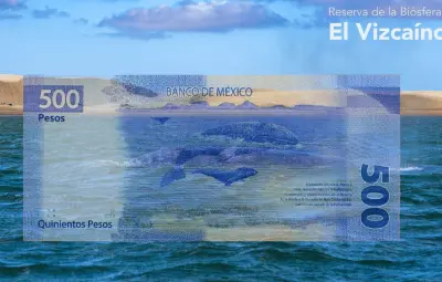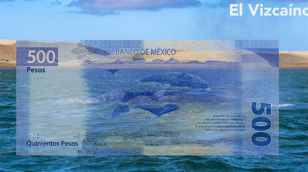 Bcs es la del billete de 500 pesos, que presenta una escena de mares e islas con la ballena gris y pastos marinos, provenientes de la Reserva de la Biosfera El Vizcaíno. Este billete, fue reconocido en 2018 como uno de los más bellos del mundo.
